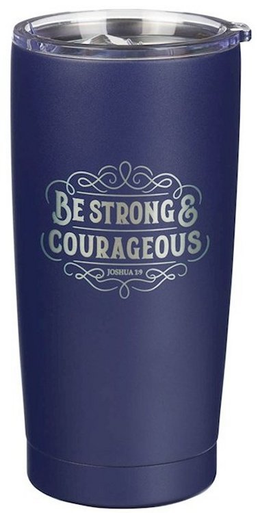 The Strong and Courageous Navy Blue Stainless Steel Travel Tumbler is part of the Be Strong and Courageous Navy Collection. This collection includes a scented candle in a glass jar, a metal keychain, a ceramic coffee mug, a spiral journal, a faux leather journal, and a stainless steel travel tumbler.
