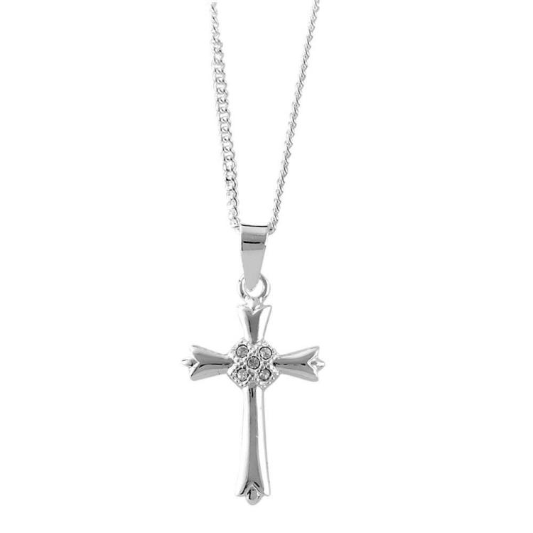 Lovely cross necklace is set at center with five cubic zirconia stones in a flower shape. Bud shape tips are the finishing touch. Silver plated pendant is 3/4 inch; silver plated chain is 18 inches. Necklace comes in a deluxe black gift box.