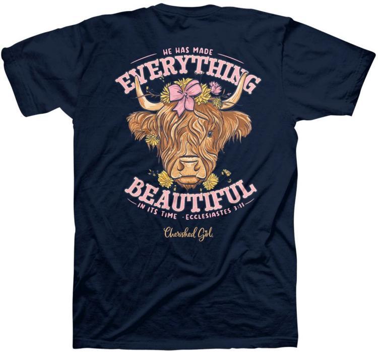 “Highland Cow Share the Good News about Jesus in this mooooo-ving Highland Cow T-shirt by Cherished Girl in Navy. The Lord has created a world of beauty for us to enjoy, and beyond all of that, He has given up the incredible hope of a future in eternity alongside Him.