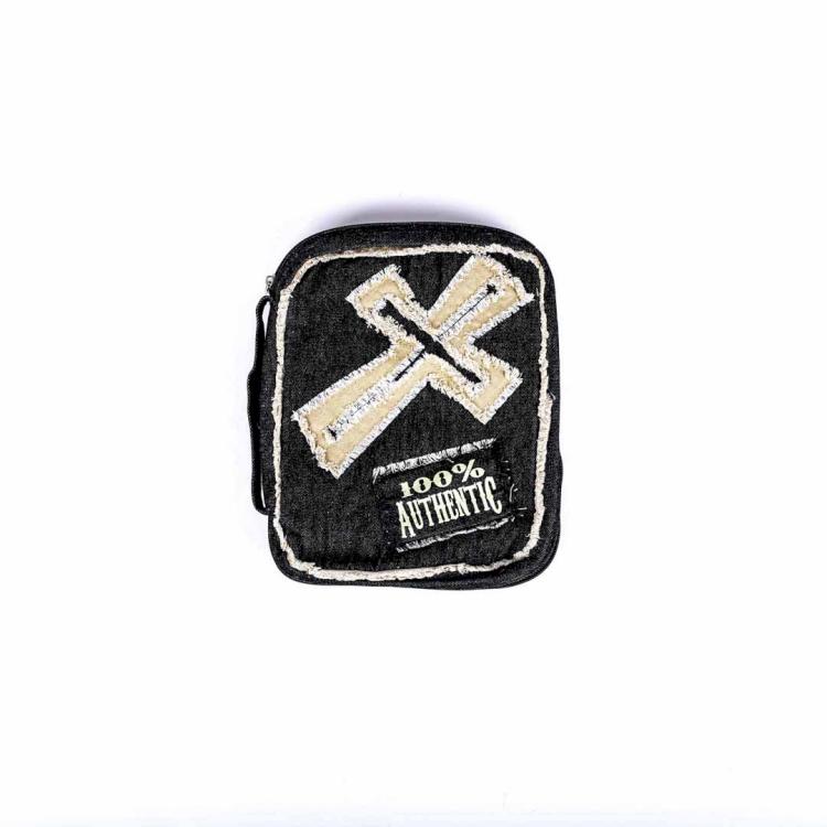 100% Authentic – Distressed Cross applique on black denim, with frayed edges and “100% Authentic” screen printed on a patch. Back outer pocket; pen loop, ribbon bookmark inside; and fish zipper pull.