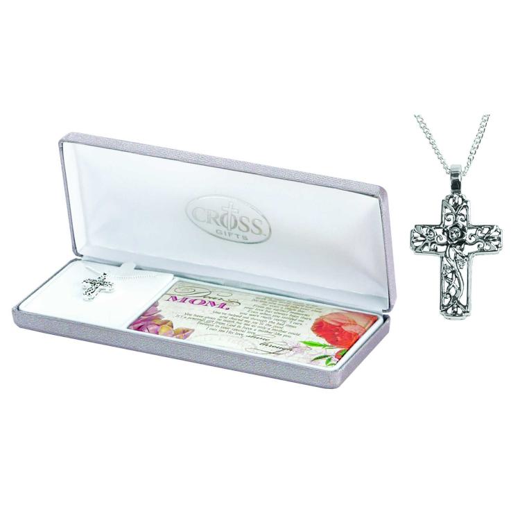 Elegant floral cross necklace is a thoughtful Christian Mother’s Day gift. Perfectly packaged for the occasion in a deluxe presentation gift box with the poem Dear Mom on a vintage floral design. Open floral design is accented with 3 crystal stones. Cross is silver plated and 7/8″” long; silver plated chain is 18″” long.