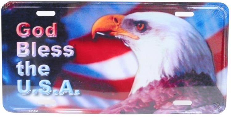 Show your faith and patriotism proudly with the autotag God Bless USA. Featuring a majestic bald eagle soaring over an American flag backdrop with the words God Bless the USA displayed boldly to the side, this eye-catching metal auto tag is a powerful symbol of your love for both God and country.