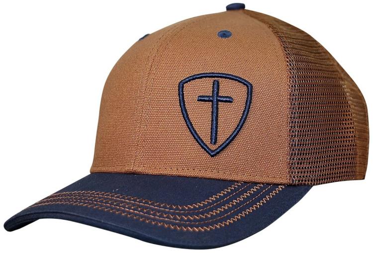 Declare yourself a conqueror in the name of Jesus in this handsome Blue Cross Shield Cap by Kerusso in Brown/Blue with topstitch detailing. The Lord goes before you in all things, and He always has your back. He is your shield and your sword in any battle, and if your foes know what s good for you they ll turn and run before you get there! Let nothing stand in your way, when you are on the path God set out for you.