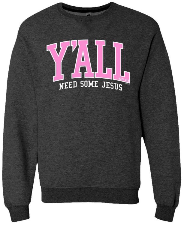 There s just something about Southern hospitality and when it meets Gospel truth, lives can change. This Y ALL Kerusso Adult Sweatshirt in Charcoal Heather is as bold as it is friendly, declaring that salvation comes through Jesus and Jesus alone.