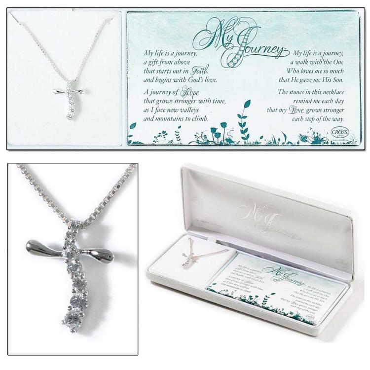 Journey necklaces are popular; and what journey is more important than our walk with Jesus Christ? This unique cross necklace is an elegant expression and daily reminder of that journey, and that He walks right alongside us every step of the way. Beautifully boxed for gift giving with the poem My Journey, this necklace makes an encouraging reminder and wonderful gift for a confirmation, graduation, birthday, or any time. Cross pendant is silver plated, 5/8 inch long, and set with 8 sparkling cubic zirconia stones. Silver plated chain is 18 inches. Poem is copyright Dicksons, Inc.