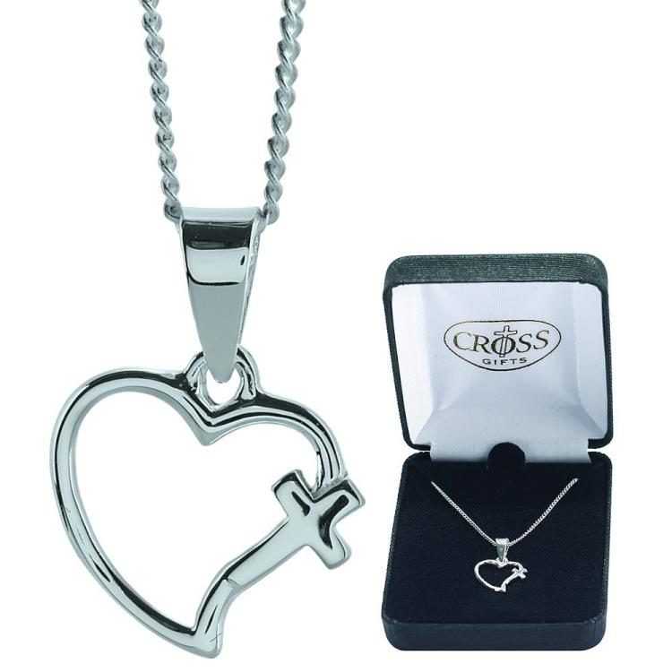 Curved open heart is accented with a petite box cross, beautifully stating that your heart belongs to Christ. Silver plated petite heart is 1/2″” long, and the silver plated chain is 18″”. In deluxe gift box.