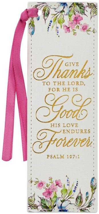 Keep a token to remember a celebration when you tuck the Give Thanks White Floral Faux Leather Bookmark between the pages of your favorite book or Bible chapter.