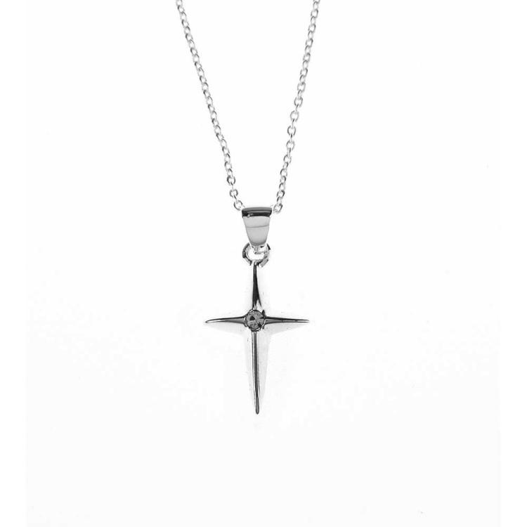 Petite star shape cross is set at center with a cubic zirconia stone. Pendant is silver plated and measures 5/8 inch. Silver plated chain is 18 inch. Necklace comes in a deluxe black gift box.