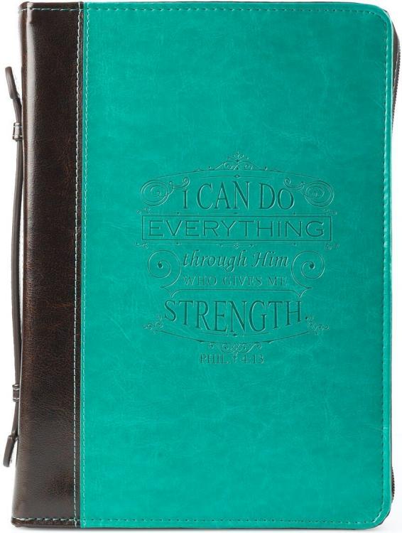 The I Can Do Everything Turquoise & Brown Faux Leather Fashion Bible Cover features a supple feel~ arresting color contrast~ and a stylized promise straight from Scripture.